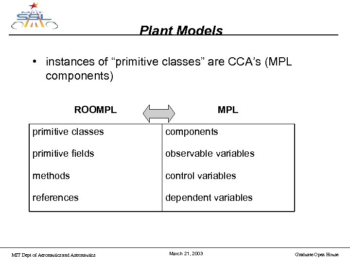 Plant Models • instances of “primitive classes” are CCA’s (MPL components) ROOMPL primitive classes components primitive fields observable variables methods control variables references dependent variables MIT Dept of Aeronautics and Astronautics March 21, 2003 Graduate Open House