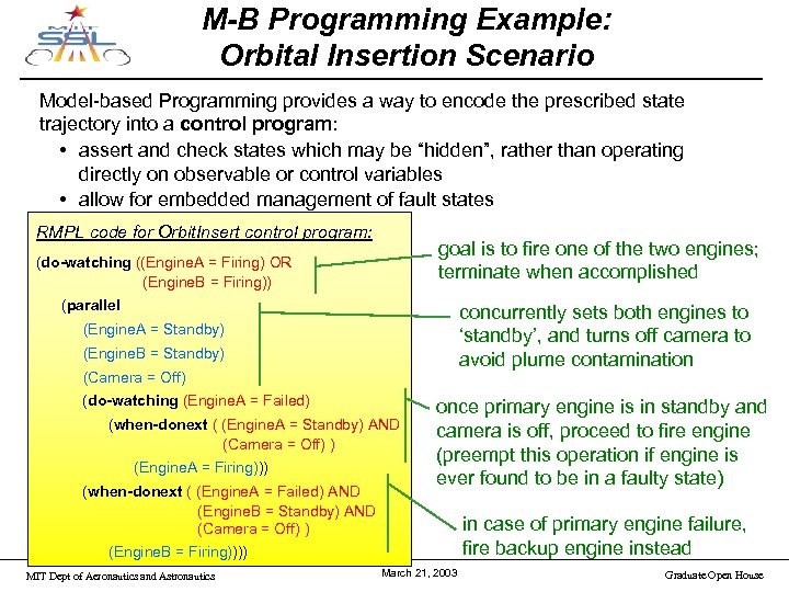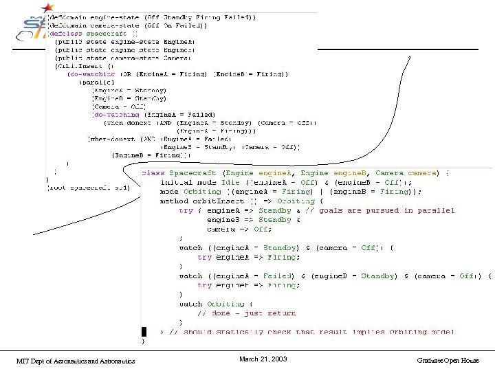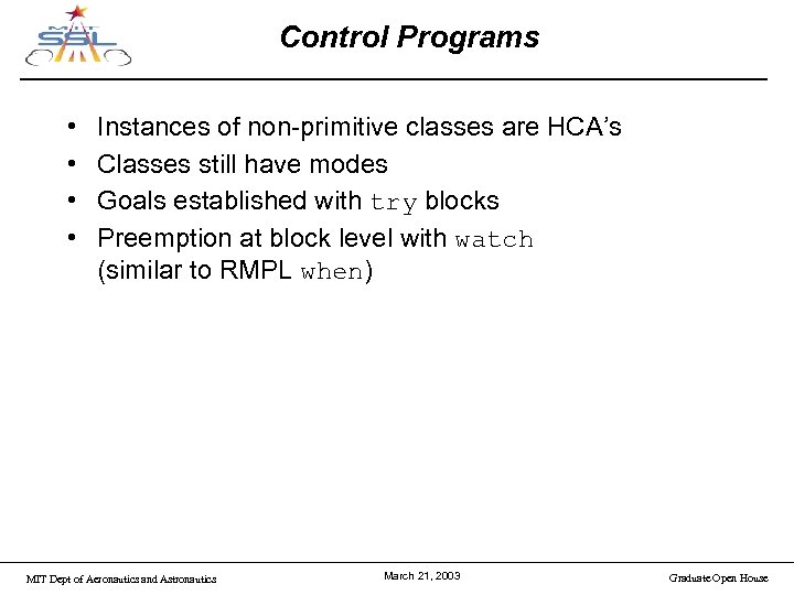 Control Programs • • Instances of non-primitive classes are HCA’s Classes still have modes Goals established with try blocks Preemption at block level with watch (similar to RMPL when) MIT Dept of Aeronautics and Astronautics March 21, 2003 Graduate Open House