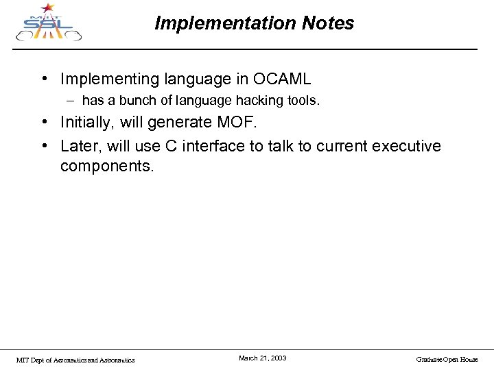 Implementation Notes • Implementing language in OCAML – has a bunch of language hacking tools. • Initially, will generate MOF. • Later, will use C interface to talk to current executive components. MIT Dept of Aeronautics and Astronautics March 21, 2003 Graduate Open House