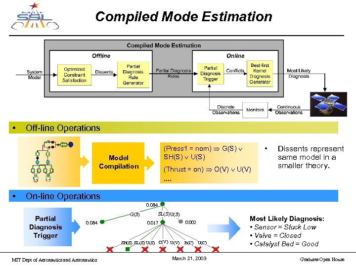 Compiled Mode Estimation • Off-line Operations Model Compilation • • (Press 1 = nom) G(S) SH(S) U(S) (Thrust = on) O(V) U(V). . Dissents represent same model in a smaller theory. On-line Operations 0. 084 Partial Diagnosis Trigger G(S) 0. 084 SL(S) U(S) 0. 002 0. 017 SH(S) SL(S) U(S) C(V) U(V) MIT Dept of Aeronautics and Astronautics B(C) U(C) March 21, 2003 Most Likely Diagnosis: • Sensor = Stuck Low • Valve = Closed • Catalyst Bed = Good Graduate Open House