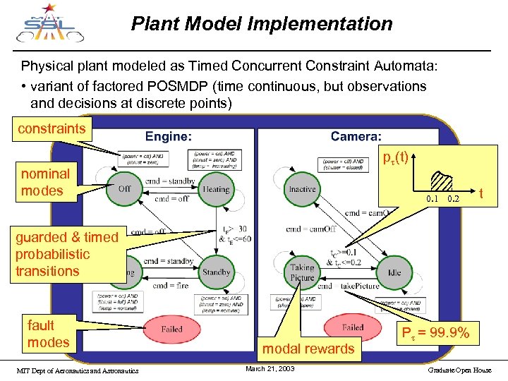 Plant Model Implementation Physical plant modeled as Timed Concurrent Constraint Automata: • variant of factored POSMDP (time continuous, but observations and decisions at discrete points) constraints pt(t) nominal modes 0. 1 0. 2 t guarded & timed probabilistic transitions fault modes MIT Dept of Aeronautics and Astronautics modal rewards March 21, 2003 Pt = 99. 9% Graduate Open House