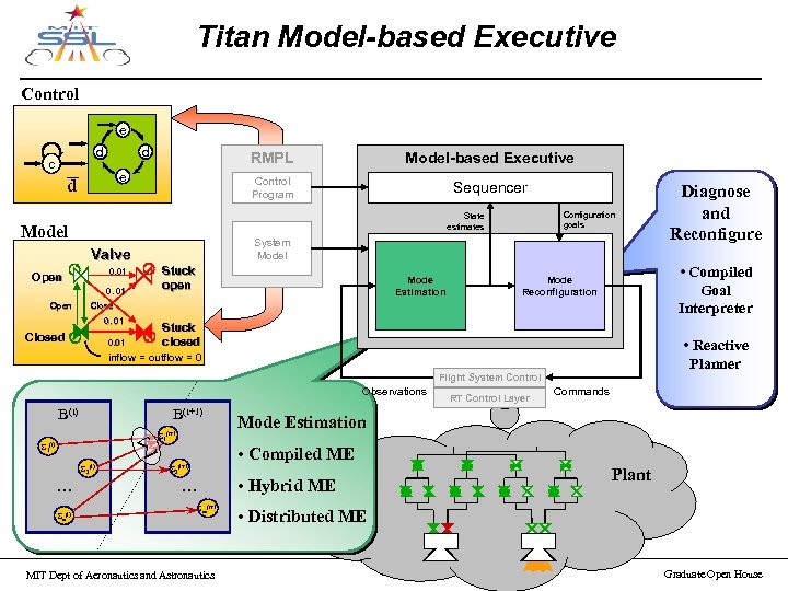 Titan Model-based Executive Control e d _ c d RMPL Control Program e d Sequencer Configuration goals State estimates Model System Model Valve Stuck open 0. 01 Open Model-based Executive Mode Estimation • Compiled Goal Interpreter Mode Reconfiguration Close 0. 01 Closed Stuck closed 0. 01 Diagnose and Reconfigure • Reactive Planner inflow = outflow = 0 Flight System Control Observations B(t) B(t+1) S 1(t) S 2(t) … Sn(t) S 1(t+1) RT Control Layer Commands Mode Estimation • Compiled ME S 2(t+1) … Sm(t+1) MIT Dept of Aeronautics and Astronautics Plant • Hybrid ME • Distributed ME March 21, 2003 Graduate Open House