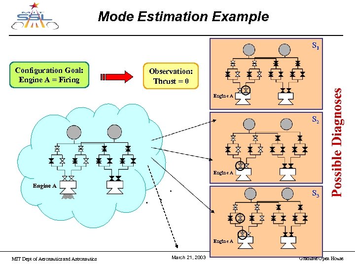 Mode Estimation Example S 1 Observation: Thrust = 0 Engine A S 2 Engine A S 3 Possible Diagnoses Configuration Goal: Engine A = Firing Engine A MIT Dept of Aeronautics and Astronautics March 21, 2003 Graduate Open House