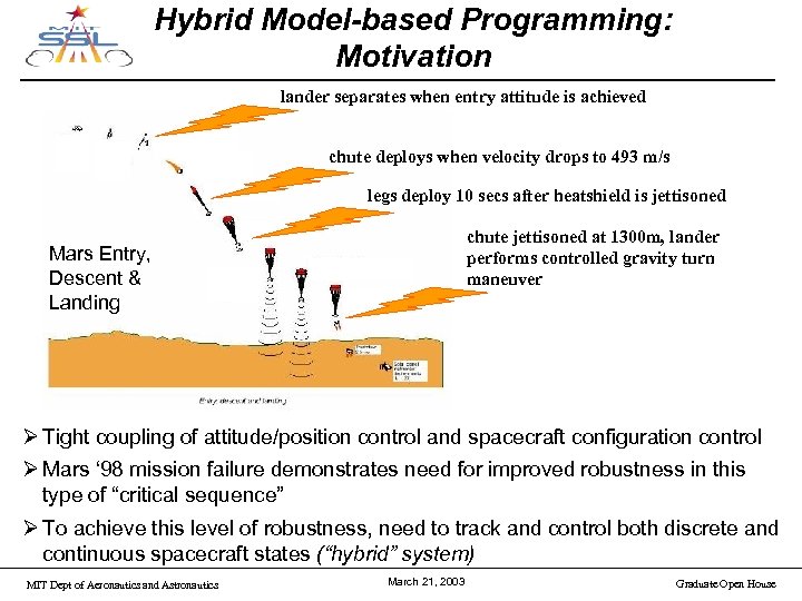 Hybrid Model-based Programming: Motivation lander separates when entry attitude is achieved chute deploys when velocity drops to 493 m/s legs deploy 10 secs after heatshield is jettisoned chute jettisoned at 1300 m, lander performs controlled gravity turn maneuver Mars Entry, Descent & Landing Ø Tight coupling of attitude/position control and spacecraft configuration control Ø Mars ‘ 98 mission failure demonstrates need for improved robustness in this type of “critical sequence” Ø To achieve this level of robustness, need to track and control both discrete and continuous spacecraft states (“hybrid” system) MIT Dept of Aeronautics and Astronautics March 21, 2003 Graduate Open House
