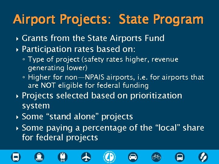Airport Projects: State Program Grants from the State Airports Fund Participation rates based on: ◦ Type of project (safety rates higher, revenue generating lower) ◦ Higher for non—NPAIS airports, i. e. for airports that are NOT eligible for federal funding Projects selected based on prioritization system Some “stand alone” projects Some paying a percentage of the “local” share for federal projects