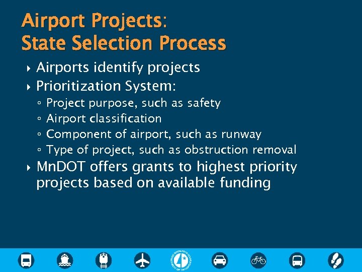 Airport Projects: State Selection Process Airports identify projects Prioritization System: ◦ ◦ Project purpose, such as safety Airport classification Component of airport, such as runway Type of project, such as obstruction removal Mn. DOT offers grants to highest priority projects based on available funding