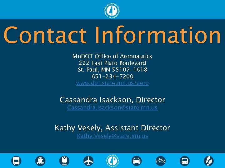 Contact Information Mn. DOT Office of Aeronautics 222 East Plato Boulevard St. Paul, MN 55107 -1618 651 -234 -7200 www. dot. state. mn. us/aero Cassandra Isackson, Director Cassandra. Isackson@state. mn. us Kathy Vesely, Assistant Director Kathy. Vesely@state. mn. us