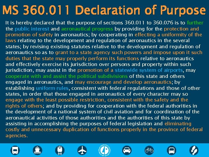MS 360. 011 Declaration of Purpose It is hereby declared that the purpose of sections 360. 011 to 360. 076 is to further the public interest and aeronautical progress by providing for the protection and promotion of safety in aeronautics; by cooperating in effecting a uniformity of the laws relating to the development and regulation of aeronautics in the several states; by revising existing statutes relative to the development and regulation of aeronautics so as to grant to a state agency such powers and impose upon it such duties that the state may properly perform its functions relative to aeronautics and effectively exercise its jurisdiction over persons and property within such jurisdiction, may assist in the promotion of a statewide system of airports, may cooperate with and assist the political subdivisions of this state and others engaged in aeronautics, and may encourage and develop aeronautics; by establishing uniform rules, consistent with federal regulations and those of other states, in order that those engaged in aeronautics of every character may so engage with the least possible restriction, consistent with the safety and the rights of others; and by providing for cooperation with the federal authorities in the development of a national system of civil aviation and for coordination of the aeronautical activities of those authorities and the authorities of this state by assisting in accomplishing the purposes of federal legislation and eliminating costly and unnecessary duplication of functions properly in the province of federal agencies.
