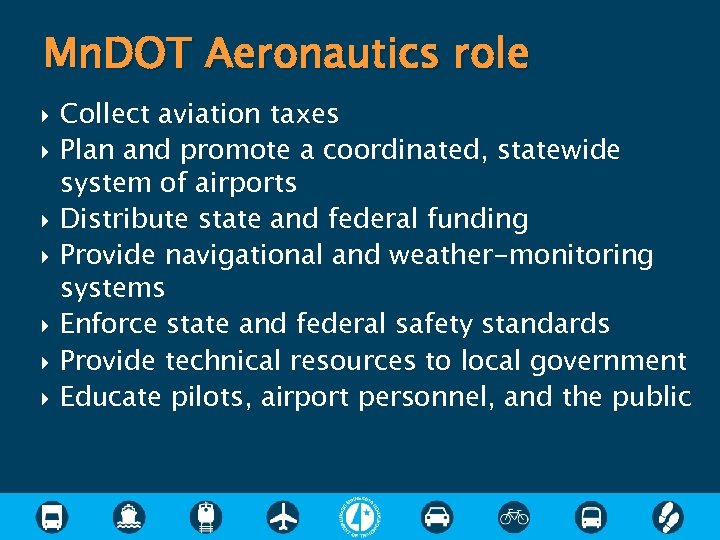 Mn. DOT Aeronautics role Collect aviation taxes Plan and promote a coordinated, statewide system of airports Distribute state and federal funding Provide navigational and weather-monitoring systems Enforce state and federal safety standards Provide technical resources to local government Educate pilots, airport personnel, and the public