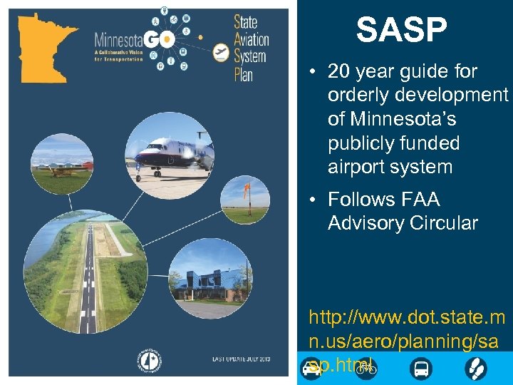 SASP • 20 year guide for orderly development of Minnesota’s publicly funded airport system • Follows FAA Advisory Circular • Published webbased http: //www. dot. state. m n. us/aero/planning/sa sp. html