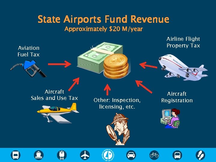 State Airports Fund Revenue Approximately $20 M/year Airline Flight Property Tax Aviation Fuel Tax Aircraft Sales and Use Tax Other: Inspection, licensing, etc. Aircraft Registration