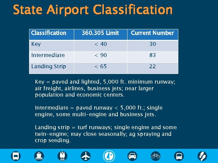 State Airport Classification 360. 305 Limit Current Number Key < 40 30 Intermediate < 90 83 Landing Strip < 65 22 Key = paved and lighted, 5, 000 ft. minimum runway; air freight, airlines, business jets; near larger population and economic centers. Intermediate = paved runway < 5, 000 ft. ; single engine, some multi-engine and business jets. Landing strip = turf runways; single engine and some twin-engine; may close seasonally; ag spraying and crop seeding.