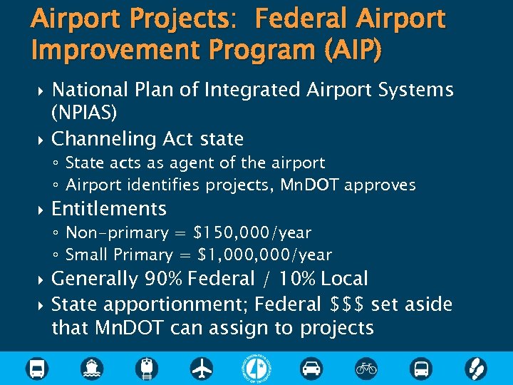 Airport Projects: Federal Airport Improvement Program (AIP) National Plan of Integrated Airport Systems (NPIAS) Channeling Act state ◦ State acts as agent of the airport ◦ Airport identifies projects, Mn. DOT approves Entitlements ◦ Non-primary = $150, 000/year ◦ Small Primary = $1, 000/year Generally 90% Federal / 10% Local State apportionment; Federal $$$ set aside that Mn. DOT can assign to projects