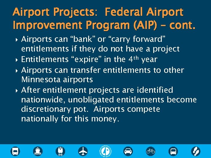 Airport Projects: Federal Airport Improvement Program (AIP) – cont. Airports can “bank” or “carry forward” entitlements if they do not have a project Entitlements “expire” in the 4 th year Airports can transfer entitlements to other Minnesota airports After entitlement projects are identified nationwide, unobligated entitlements become discretionary pot. Airports compete nationally for this money.