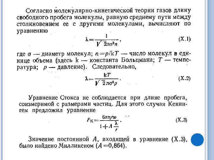 МОЛЕКУЛЯРНО-КИНЕТИЧЕСКИЕ СВОЙСТВА АЭРОЗОЛЕЙ Малая концентрация частиц дисперсной фазы Большой пробег молекул газа по сравнению с размером частиц Малая вязкость частиц дисперсионной среды Малая плотность дисперсионной среды Размер частиц в аэрозолях колеблется примерно от 1 нм до долей мм, например, размеры капелек облаков 5— 50 мкм, частиц табачного дыма — десятые доли мкм, в пыли содержатся обычно частицы весьма различных