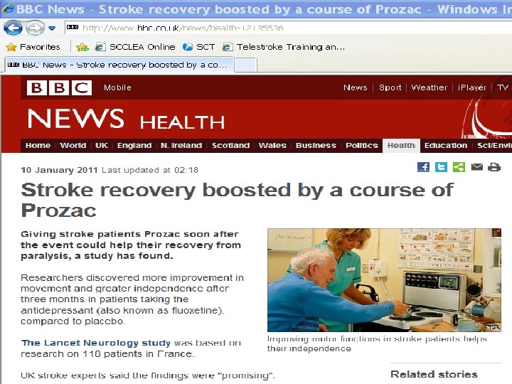 Fluoxetine Animal studies suggest fluoxetine is effective ? directly improves motor function ? indirectly improves motivation and attention FLAME trial (Lancet Neurology, 2011; 10: 123 -130) • Fluoxetine on Motor Rehabilitation after ischaemic stroke • RCT: 118 with acute ischaemic stroke & unilateral motor weakness • Intervention: 20 mg fluoxetine daily, 3 months vs. placebo