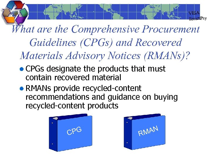 VISA Smart. Pay What are the Comprehensive Procurement Guidelines (CPGs) and Recovered Materials Advisory Notices (RMANs)? CPGs designate the products that must contain recovered material RMANs provide recycled-content recommendations and guidance on buying recycled-content products CPG MAN R