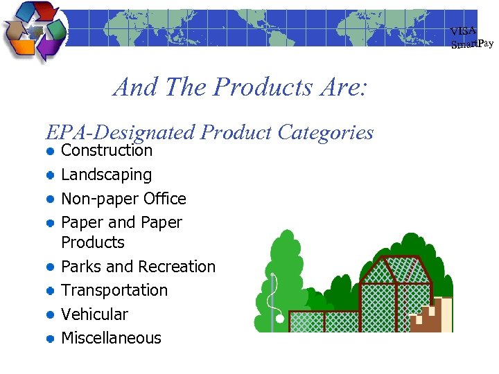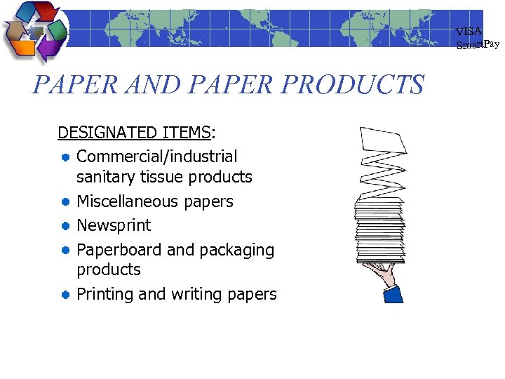 VISA Smart. Pay And The Products Are: EPA-Designated Product Categories Construction Landscaping Non-paper Office Paper and Paper Products Parks and Recreation Transportation Vehicular Miscellaneous