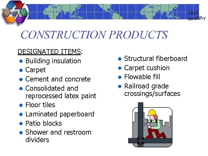 VISA Smart. Pay CONSTRUCTION PRODUCTS DESIGNATED ITEMS: Building insulation Carpet Cement and concrete Consolidated and reprocessed latex paint Floor tiles Laminated paperboard Patio blocks Shower and restroom dividers Structural fiberboard Carpet cushion Flowable fill Railroad grade crossings/surfaces