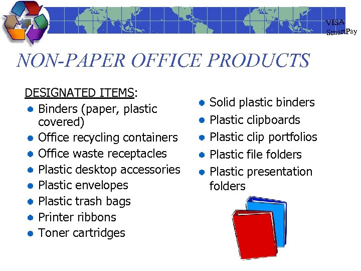 VISA Smart. Pay NON-PAPER OFFICE PRODUCTS DESIGNATED ITEMS: Binders (paper, plastic covered) Office recycling containers Office waste receptacles Plastic desktop accessories Plastic envelopes Plastic trash bags Printer ribbons Toner cartridges Solid plastic binders Plastic clipboards Plastic clip portfolios Plastic file folders Plastic presentation folders