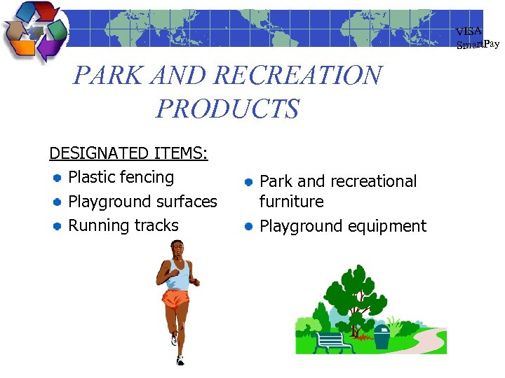 VISA Smart. Pay PARK AND RECREATION PRODUCTS DESIGNATED ITEMS: Plastic fencing Playground surfaces Running tracks Park and recreational furniture Playground equipment