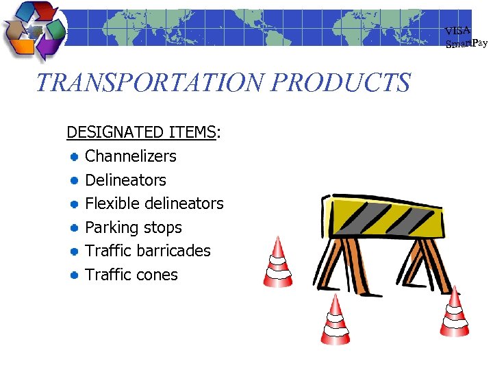 VISA Smart. Pay TRANSPORTATION PRODUCTS DESIGNATED ITEMS: Channelizers Delineators Flexible delineators Parking stops Traffic barricades Traffic cones