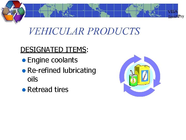 VISA Smart. Pay VEHICULAR PRODUCTS DESIGNATED ITEMS: Engine coolants Re-refined lubricating oils Retread tires