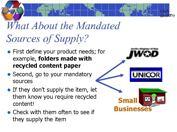 VISA Smart. Pay What About the Mandated Sources of Supply? First define your product needs; for example, folders made with recycled content paper Second, go to your mandatory sources If they don’t supply the item, let them know you require recycled content! Check with them often to see if they supply the item Small Businesses