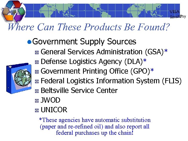 VISA Smart. Pay Where Can These Products Be Found? Government Supply Sources General Services Administration (GSA)* Defense Logistics Agency (DLA)* Government Printing Office (GPO)* Federal Logistics Information System (FLIS) Beltsville Service Center JWOD UNICOR *These agencies have automatic substitution (paper and re-refined oil) and also report all federal purchases up the chain!