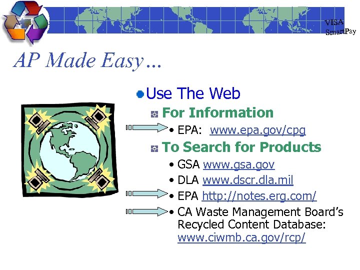 VISA Smart. Pay AP Made Easy… Use The Web For Information • EPA: www. epa. gov/cpg To Search for Products • GSA www. gsa. gov • DLA www. dscr. dla. mil • EPA http: //notes. erg. com/ • CA Waste Management Board’s Recycled Content Database: www. ciwmb. ca. gov/rcp/
