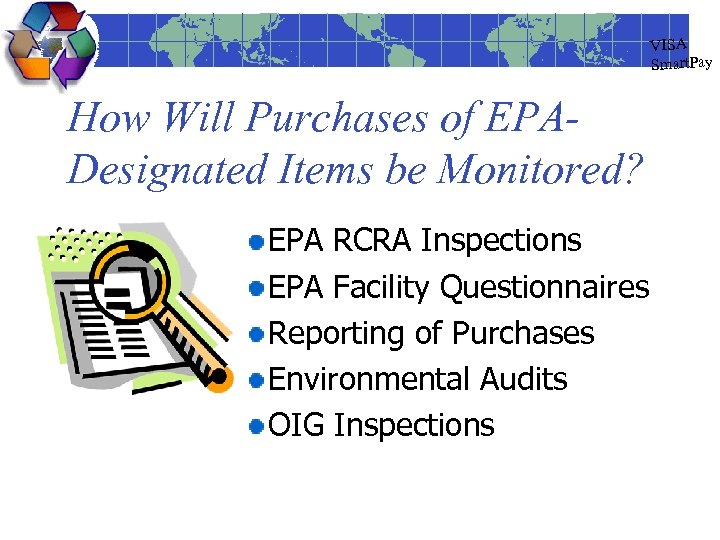 VISA Smart. Pay How Will Purchases of EPADesignated Items be Monitored? EPA RCRA Inspections EPA Facility Questionnaires Reporting of Purchases Environmental Audits OIG Inspections