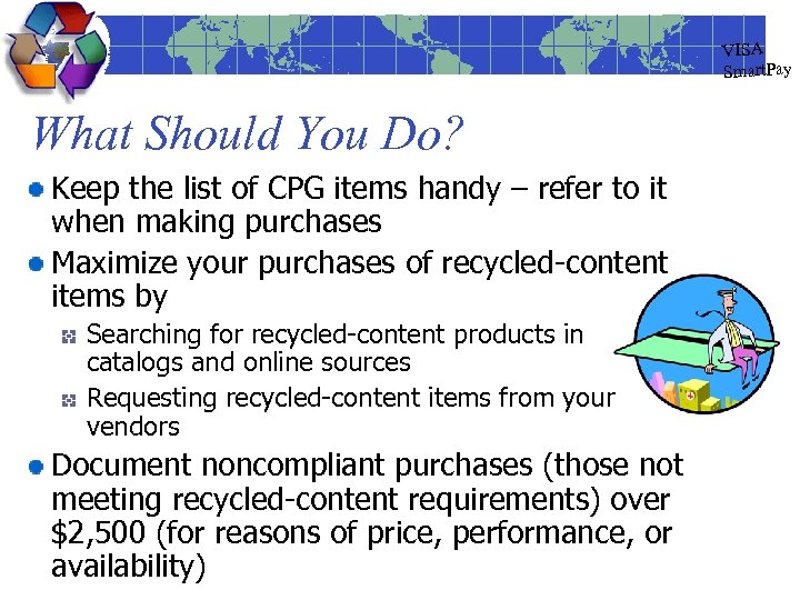 VISA Smart. Pay What Should You Do? Keep the list of CPG items handy – refer to it when making purchases Maximize your purchases of recycled-content items by Searching for recycled-content products in catalogs and online sources Requesting recycled-content items from your vendors Document noncompliant purchases (those not meeting recycled-content requirements) over $2, 500 (for reasons of price, performance, or availability)