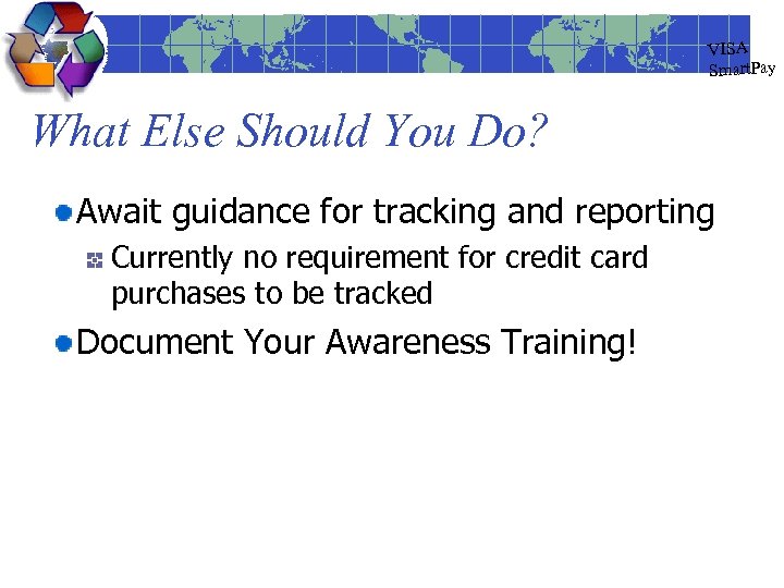 VISA Smart. Pay What Else Should You Do? Await guidance for tracking and reporting Currently no requirement for credit card purchases to be tracked Document Your Awareness Training!