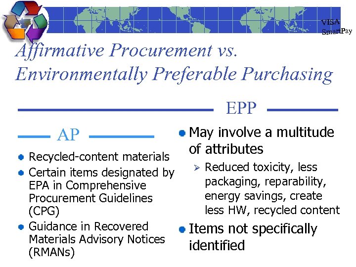VISA Smart. Pay Affirmative Procurement vs. Environmentally Preferable Purchasing EPP AP Recycled-content materials Certain items designated by EPA in Comprehensive Procurement Guidelines (CPG) Guidance in Recovered Materials Advisory Notices (RMANs) May involve a multitude of attributes Ø Reduced toxicity, less packaging, reparability, energy savings, create less HW, recycled content Items not specifically identified