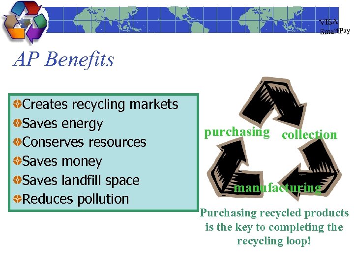 VISA Smart. Pay AP Benefits Creates recycling markets Saves energy Conserves resources Saves money Saves landfill space Reduces pollution purchasing collection manufacturing Purchasing recycled products is the key to completing the recycling loop!