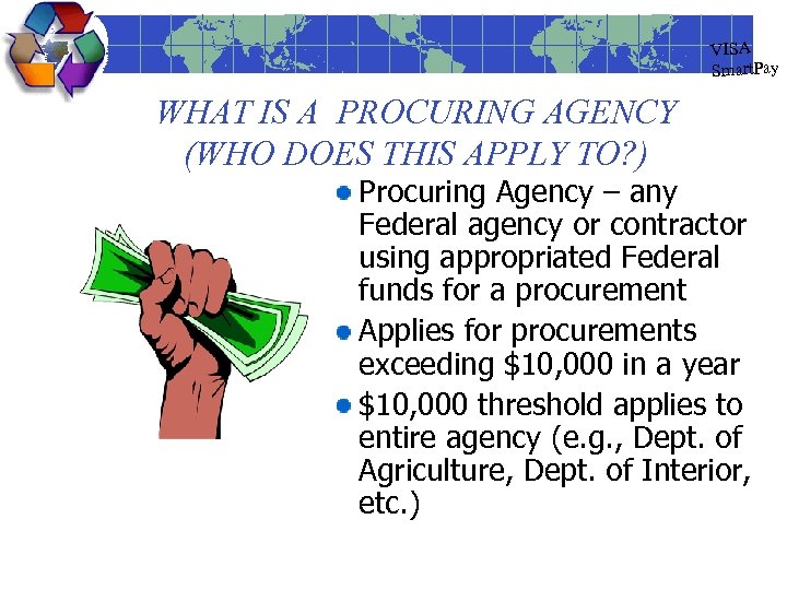 VISA Smart. Pay WHAT IS A PROCURING AGENCY (WHO DOES THIS APPLY TO? ) Procuring Agency – any Federal agency or contractor using appropriated Federal funds for a procurement Applies for procurements exceeding $10, 000 in a year $10, 000 threshold applies to entire agency (e. g. , Dept. of Agriculture, Dept. of Interior, etc. )