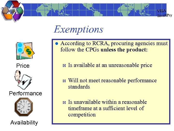 VISA Smart. Pay Exemptions According to RCRA, procuring agencies must follow the CPGs unless the product: Price Is available at an unreasonable price Will not meet reasonable performance standards Performance Is unavailable within a reasonable timeframe at a sufficient level of competition Availability