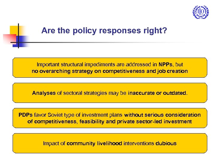 Are the policy responses right? Important structural impediments are addressed in NPPs, but no overarching strategy on competitiveness and job creation Analyses of sectoral strategies may be inaccurate or outdated. PDPs favor Soviet type of investment plans without serious consideration of competitiveness, feasibility and private sector-led investment Impact of community livelihood interventions dubious