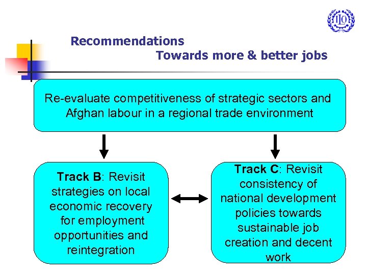 Recommendations Towards more & better jobs Re-evaluate competitiveness of strategic sectors and Afghan labour in a regional trade environment Track B: Revisit strategies on local economic recovery for employment opportunities and reintegration Track C: Revisit consistency of national development policies towards sustainable job creation and decent work