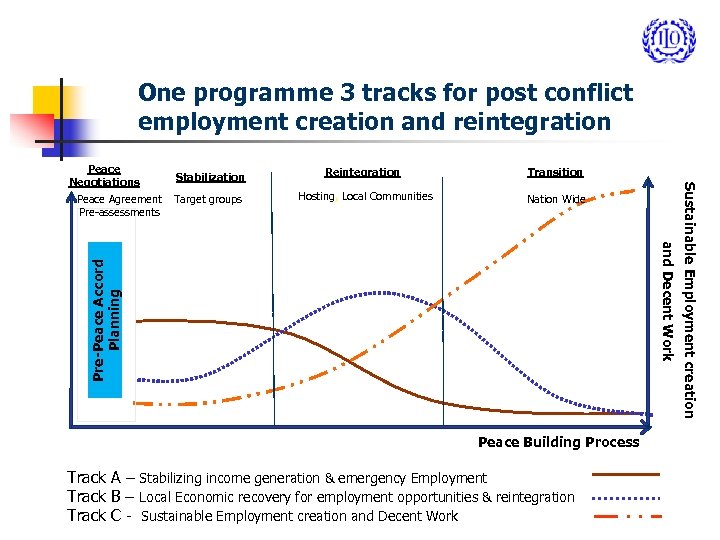 One programme 3 tracks for post conflict employment creation and reintegration Reintegration Transition Target groups Hosting, Local Communities Nation Wide and Decent Work Pre-Peace Accord Planning Peace Agreement Pre-assessments Stabilization Peace Building Process Track A – Stabilizing income generation & emergency Employment Track B – Local Economic recovery for employment opportunities & reintegration Track C - Sustainable Employment creation and Decent Work Sustainable Employment creation Peace Negotiations