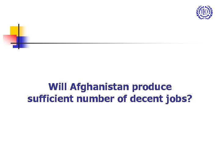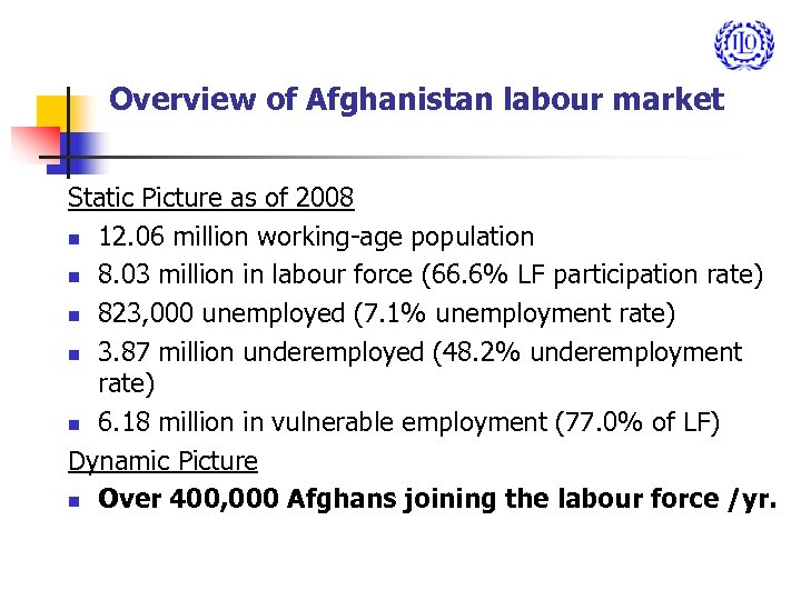 Overview of Afghanistan labour market Static Picture as of 2008 n 12. 06 million working-age population n 8. 03 million in labour force (66. 6% LF participation rate) n 823, 000 unemployed (7. 1% unemployment rate) n 3. 87 million underemployed (48. 2% underemployment rate) n 6. 18 million in vulnerable employment (77. 0% of LF) Dynamic Picture n Over 400, 000 Afghans joining the labour force /yr.