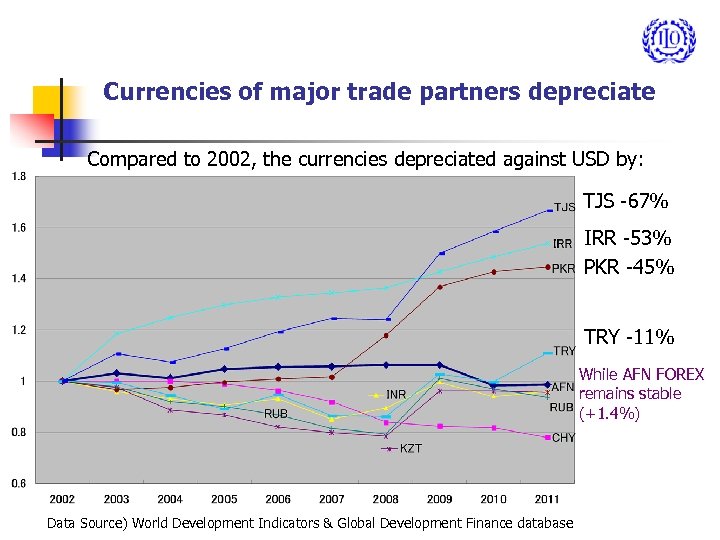 Currencies of major trade partners depreciate Compared to 2002, the currencies depreciated against USD by: TJS -67% IRR -53% PKR -45% TRY -11% While AFN FOREX remains stable (+1. 4%) Data Source) World Development Indicators & Global Development Finance database