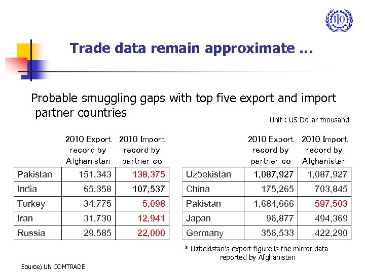 Trade data remain approximate … Probable smuggling gaps with top five export and import partner countries Unit : US Dollar thousand 2010 Export 2010 Import record by Afghanistan partner co Pakistan 2010 Export 2010 Import record by partner co Afghanistan 151, 343 138, 375 Uzbekistan India 65, 358 107, 537 China Turkey 34, 775 5, 098 Iran 31, 730 12, 941 Japan Russia 29, 585 22, 000 Germany Pakistan 1, 087, 927 175, 265 703, 845 1, 684, 666 597, 503 96, 877 494, 369 356, 533 422, 290 * Uzbekistan's export figure is the mirror data reported by Afghanistan Source) UN COMTRADE