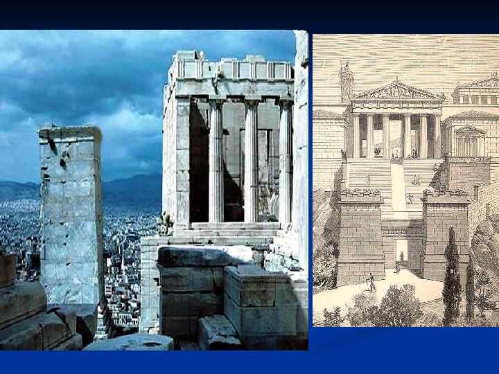 Судьба храмов Акрополя n n n Парфенон, превращенный сначала в христианскую церковь Богоматери, при крестоносцах (1209 г. ) был преобразован в церковь святой Марии Афинской После завоевания Греции турками (1460 г. ) Парфенон превратился в мусульманскую мечеть, к которой пристроили минареты в юго-восточной части, затем — в арсенал. Тогда же Эрехтейон стал гаремом турецкого паши. храм Ники Аптерос был разобран, из его блоков сложена стена бастиона. Позднее греки нашли почти все блоки и сложили храм Ники Аптерос заново, восстановили заново после разрушения и пожара Эрехтейон.