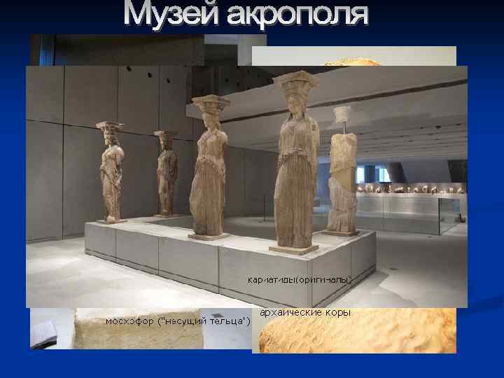 В Музее Акрополя хранятся бесценные сокровища. n • Мосхофор – «несущий Тельца» исключительно изысканная скульптура VI века до н. э. изображает молодого мужчину, несущего на плечах тельца в приношение богине Афине.