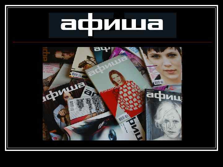 «Афиша» — крупнейший российский журнал, специализирующийся на освещении городских событий в сфере развлечений.