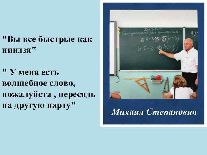 "Вы все быстрые как ниндзя" " У меня есть волшебное слово, пожалуйста , пересядь на другую парту" Михаил Степанович