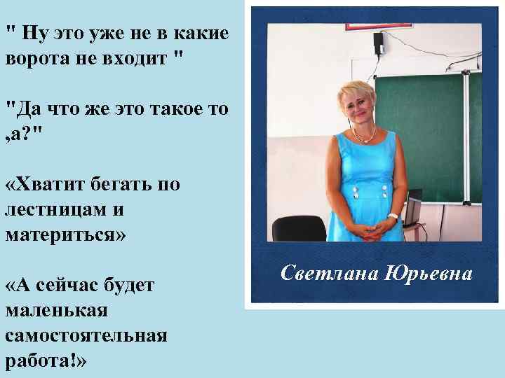 " Ну это уже не в какие ворота не входит " "Да что же это такое то , а? " «Хватит бегать по лестницам и материться» «А сейчас будет маленькая самостоятельная работа!» Светлана Юрьевна