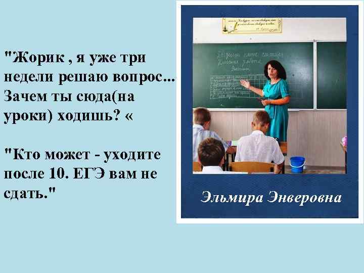 "Жорик , я уже три недели решаю вопрос. . . Зачем ты сюда(на уроки) ходишь? « "Кто может - уходите после 10. ЕГЭ вам не сдать. " Эльмира Энверовна