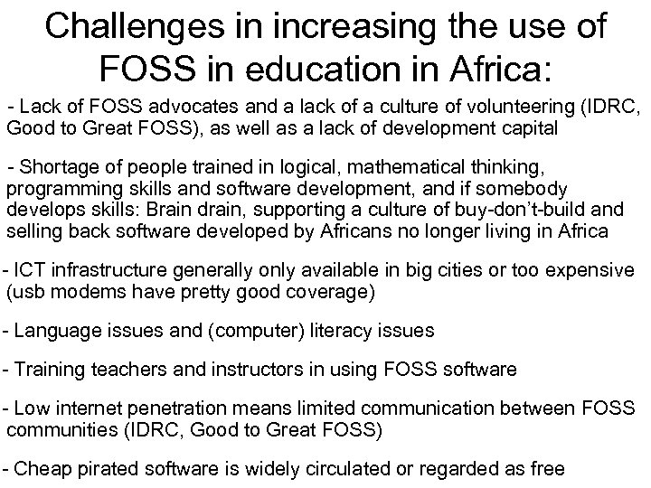 Challenges in increasing the use of FOSS in education in Africa: - Lack of FOSS advocates and a lack of a culture of volunteering (IDRC, Good to Great FOSS), as well as a lack of development capital - Shortage of people trained in logical, mathematical thinking, programming skills and software development, and if somebody develops skills: Brain drain, supporting a culture of buy-don’t-build and selling back software developed by Africans no longer living in Africa - ICT infrastructure generally only available in big cities or too expensive (usb modems have pretty good coverage) - Language issues and (computer) literacy issues - Training teachers and instructors in using FOSS software - Low internet penetration means limited communication between FOSS communities (IDRC, Good to Great FOSS) - Cheap pirated software is widely circulated or regarded as free